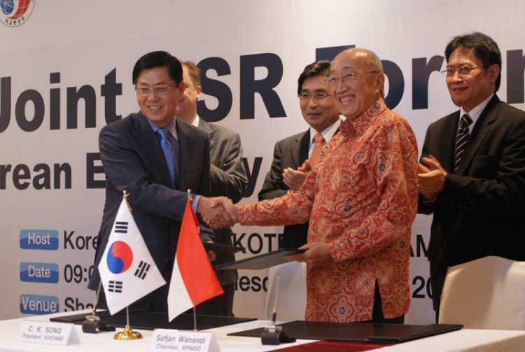 3. 특히, 금번 포럼에서는 재인니상공회의소(송창근 수석부회장)와 인도네시아 경총(소피안 와난디 회장)이 양국의 업계간에 CSR 활동 강화를 위해 협력하자는 양해각서를 체결하는 성과가 있었다.(김영선 대사, 이만 통상부 총국장, 반 루이스 ILO 소장 임석)