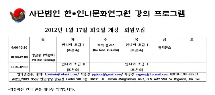 한.인니 문화연구원 "1월 문화교실 강의 시간표" 댓글2개