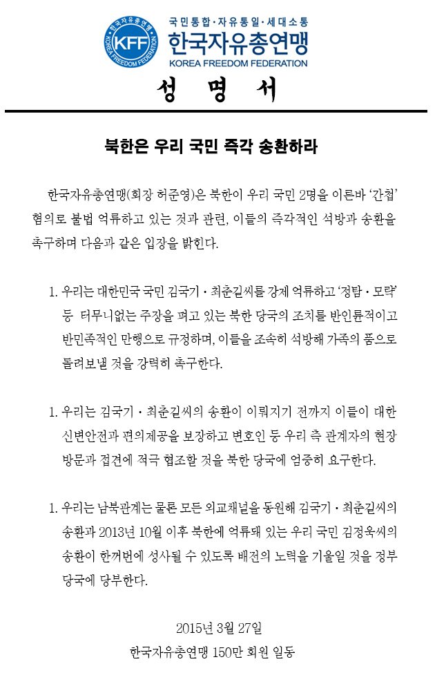 북한은 우리 국민 즉각 송환하라-출처/한인포스트 댓글1개