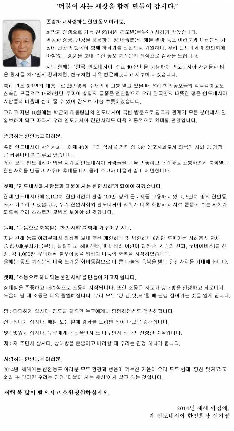 재인도네시아 한인회장 신기엽 2014년 신년사