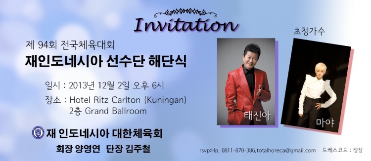 이제 2013년의 대미를 장식하는 “제94회 전국체육대회 재인도네시아 선수단 해단식”을 준비하였습니다. 우리 해단식은 우리 선수 임원의 잔치이며 우리를 일년동안 물심 양면으로 성원해주신 친지를 초대하여, 준비한 우리 재인도네시아 대한체육회의 축제입니다.