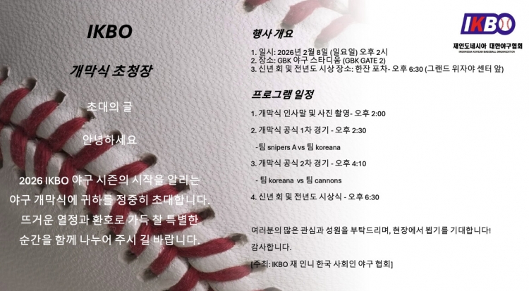 2026 IKBO 야구 시즌의 시작을 알리는 야구 개막식에 귀하를 정중히 초대합니다.