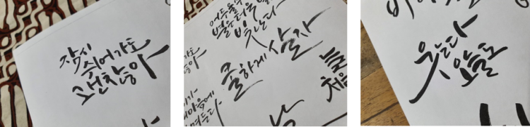 마스크를 착용한 상태로 오대표님은 차근차근 설명해 주셨다. 부채의 재질, 색상, 특징에 따라 다른 장, 단점을 배웠고 다음으로는 글귀를 정해야 캘리그라피 연습을 효율성 있게 할 수 있다고 하셨다. 각자 마음에 드는 글귀를 골랐고 본격적인 연습시간이 되었을 때 비로소 깨달았다. 이것이 생각만큼 쉬운 것이 아니라는 것을. 캘리그라피는 감성과 많은 시간, 노력으로 만들어지는 것이었다.