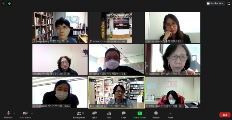 주인도네시아 한국문화원은 인도네시아의 세종학당장 6명과 세종학당재단 본부 담당자가 참석한 가운데 제1회 인도네시아 세종학당장 회의를 2021년 1월 6일 온라인으로 개최했다.
