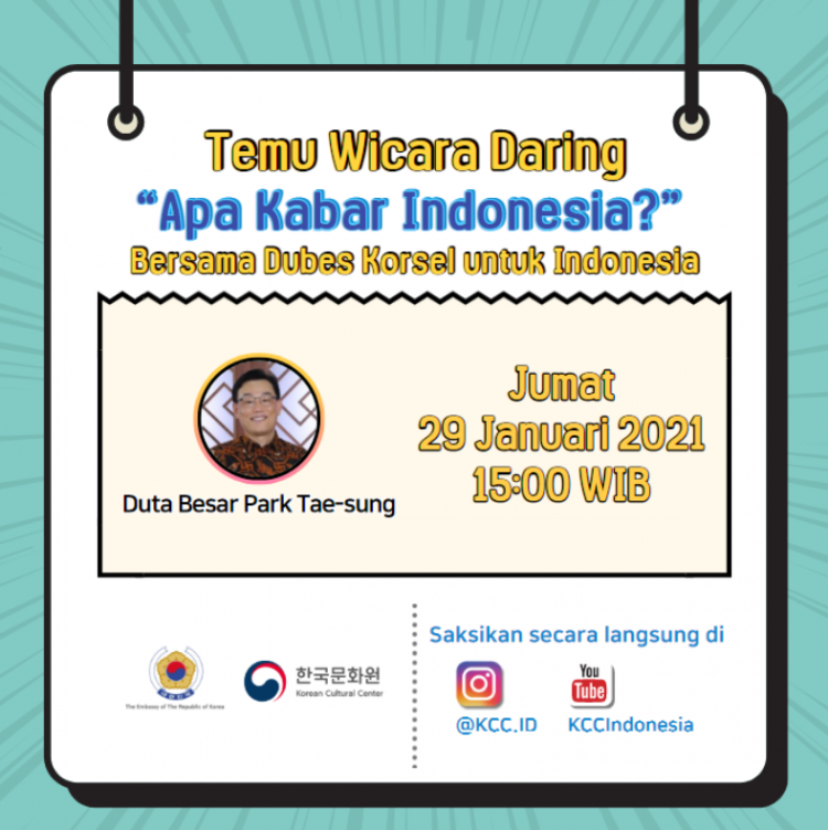 박태성 주인도네시아대사는 1월 29일 인도네시아의 한국 서포터즈와 한류팬들을 초청하여 공공외교 토크쇼 ‘아빠 까바르 인도네시아(Apa Kabar Indonesia)' 행사를 온라인으로 개최하였다.