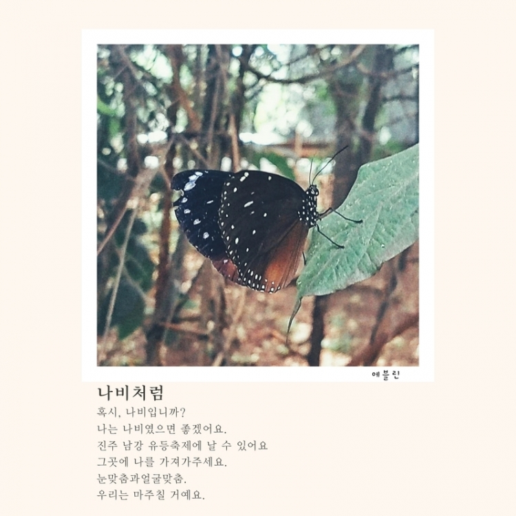 ‘아름다운 이별’과 ‘나비처럼’이라는 제목의 우수작 2점은 지리산 단풍에서 얻은 영감과 진주 유등축제에 가고 싶은 마음을 시적 감수성으로 잘 표현하여 우수 작품으로 선정되었다.