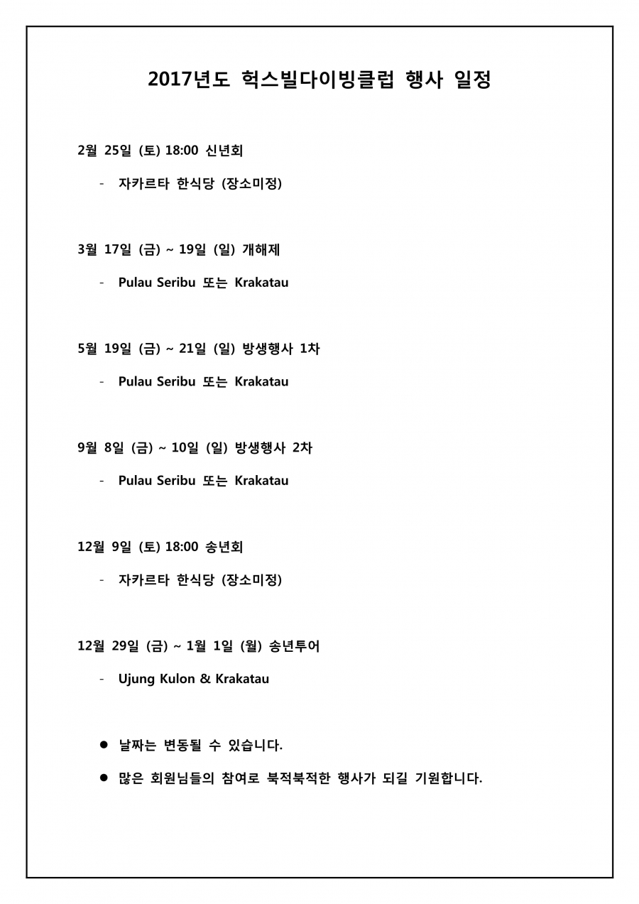 2017년도 헉스빌 다이빙클럽 행사 일정
