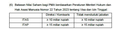 다만 비자 연장이 돌아오는 분들은, 상기내역을 파악하시어 새로운 규정대로 지분을 인상하시고 또 그러기 위해서는 회사의 지분 자체를 1인 주주의 경우 100억 이상, 만일 두 분이 사용을 하기 위해서는 즉 최소 200억 루피아 이상으로 지분을 증자하셔야 합니다.