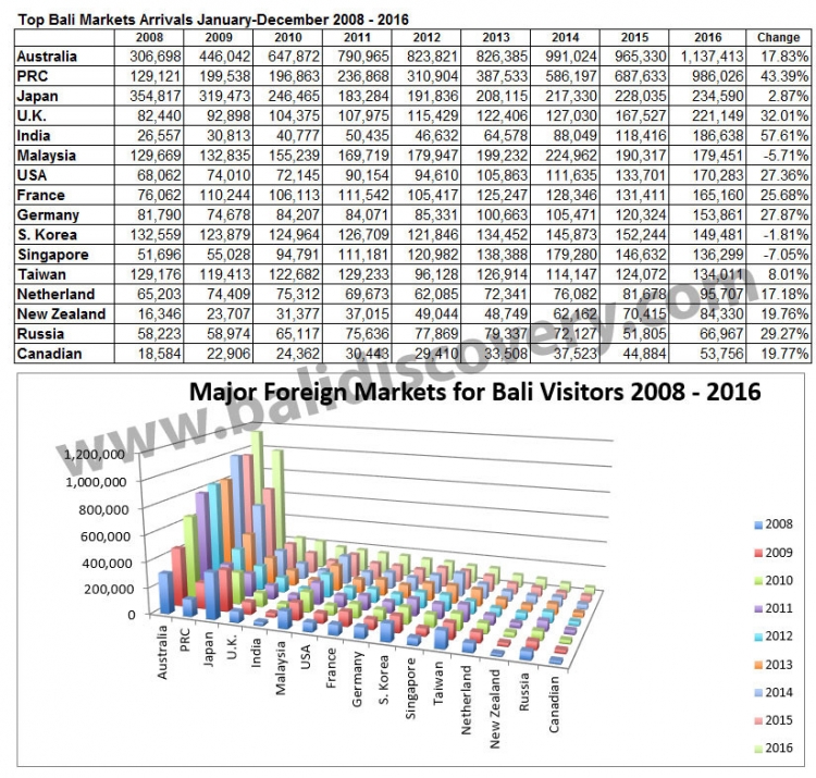 발리 방문 외국인 수 1위는 몇년째 수위를 유지하고 있는 호주로 113만명이었고, 2위는 폭발적인 증가세를 유지하면서 올해나 내년에는 1위를 차지할 것으로 보이는 중국이었다. 중국은 전년대비 43,39% 증가한 98만명을 기록했다. 3위는 일본으로 2위 중국과의 차이가 4배 이상 나는 23만명에 그쳤다. 4위와 5위는 전년대비 32%와 57%라는 엄청난 증가를 보인 영국과 인도가 차지했다. 그다음으로는 말레이시아 , 미국, 프랑스, 독일이 차지했고 한국은 10위에 그쳤다.