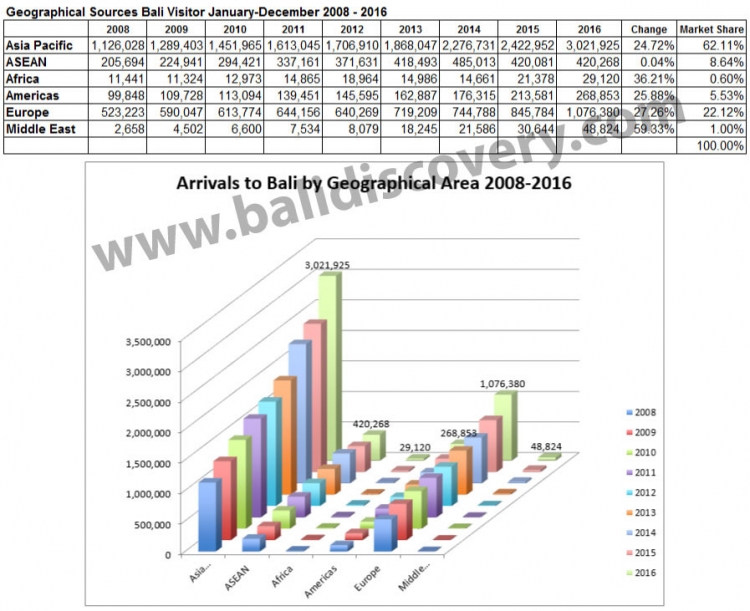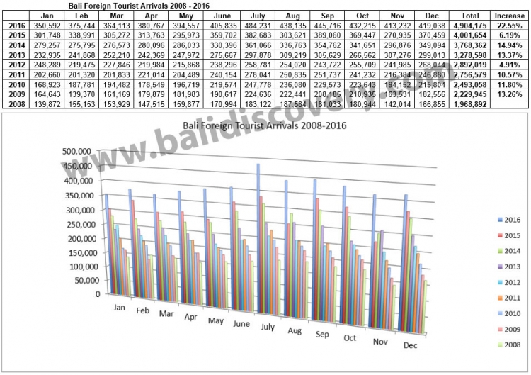 2016년 발리를 방문한 외국인 수는 2015년보다 22.55% 증가한 4,904,175명이었다. 이는 역사상 최대 증가폭을 나타냈지만 한국인 방문자는 전년대비 1.81% 줄어든 149,181명이었다.