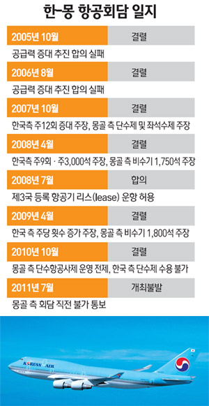 이 같은 협상논리 제공은 대한항공이 인천~몽골 울란바토르 노선 단독 운항 체제를 유지하기 위한 것으로 풀이된다. 우리 정부는 그동안 인천~몽골 울란바토르 노선의 고운임ㆍ좌석난을 해결하기 위해 여러 항공사가 취항하기를 주장했으며 몽골은 이에 반대했다.