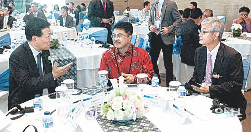 KDB대우증권이5일 인도네시아 자카르타에서 개최한 ‘한국-인도네시아 자본시장포럼’에 참가한 김기범 대우증권 사장, 이토 와르시토 인도네시아 증권거래소 이사장, 오유성 대우증권 인도네시아 현지법인장(왼쪽부터). 대우증권은 인도네시아 시장 진출을 본격화할 계획이다. KDB대우증권 제공