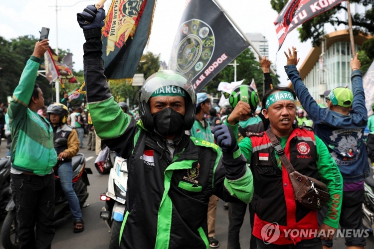 (자카르타 로이터=연합뉴스) 20일 인도네시아 수도 자카르타에서 차량공유업체 소속 오토바이 운전기사들이 처우 개선을 요구하며 시위를 벌이고 있다. 2025.5.21. photo@yna.co.kr