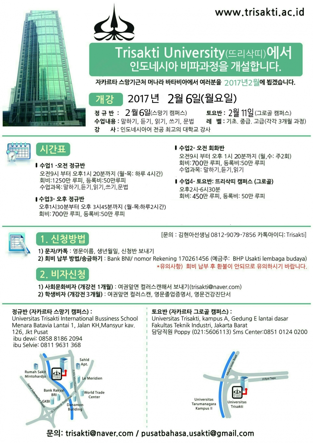 자카르타 뜨리삭티대학교 2017년 2월 6일 비파 개강안내