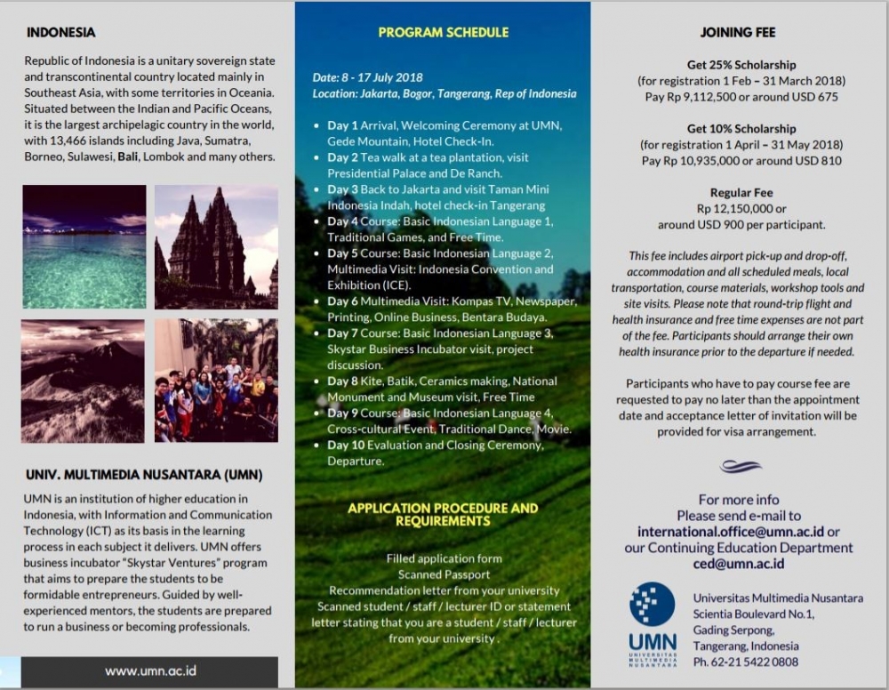 2.Get 10% Scholarship (for registration 1 April – 31 May 2018) Pay Rp 10,935,000 or around USD 810