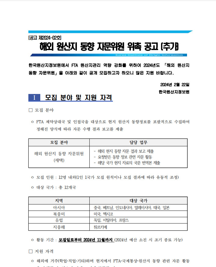 [ 공지 ] 2024년 해외 원산지 동향 자문위원 위촉 공고(추가)