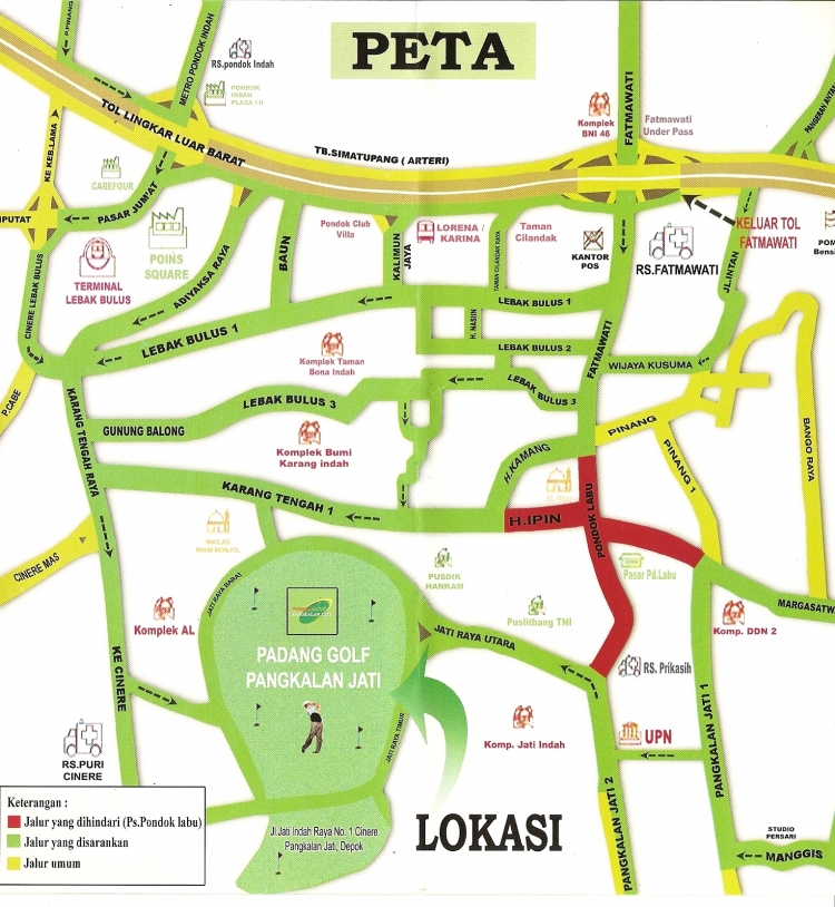 아... 지도를 보니까 빨간길은 그 길을 피해라는 Jalur yang dihindari 군요. 그리고 recommend하는 길을 녹색으로 표시했네요. 다음에는 복잡한 Podok Labu 시장(Pasar)를 피해서 가야지....