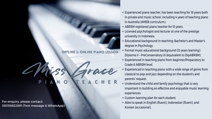 I wish we'll have got a delightful and funny piano lesson. • Experienced piano teacher that has been teaching for 18 years both in private and music school, including 4 years of teaching piano in Australia (AMEB curriculum). • ABRSM registered piano teacher for 15 years. • Licensed psychologist and lecturer at one of the prestige university in Indonesia. • Educational background in teaching: Bachelor’s and Master's degree in Psychology). • Formal music education background (12 years learning): Diploma I – equivalent to Grade 8 ABRSM, and Diploma II – PreConservatory III equivalent to DipABRSM. • Experienced in teaching piano from beginner/Preparatory to Grade 8 ABRSM level, with a wide range of genre from classical to pop and jazz depending on the students' and parents' request. • Understanding the child and family psychology that is very important in building effective and enjoyable music learning experiences. • Custom learning plan for each student. - 다양한 교습경험과 실력있는 피아노 강사 : 음악 아카데미 소속 및 개인교습으로 18년의 피아노 교습 경력. : 4년의 호주 음악 시험국 (Australian Music Examinations Board) 커리큘럼에 따른 피아노 교습 (멜버른) 포함 - 15년의 ABRSM(The Associated Board of the Royal Schools of Music) 공인 등록 (자카르타) - 인도네시아 명문대학의 심리학 학사/ 석사 학위 취득 및 강의 경력 - 학력 ; 심리학 학사 / 석사 - 12년의 정규 음악스쿨 교육으로 DipABRSM 에 상응하는 디플로마 Ⅱ, Preconservatory Ⅲ 자격 보유 - 입문자 수준부터 ABRSM 8등급의 피아노 티칭 경력 - 수강생과 부모님의 요청에 따라서 클래식, 팝, 재즈 등 여러 장르의 티칭 가능 - 수강생과 부모님의 심리학적 측면에 접근하여 효과적이고 즐기면서 배우는 피아노 티칭 노하우 - 각 수강생의 수준별 맞춤 식 피아노 티칭 플랜 - 사용언어 (Lingual skills) ; 영어 – 네이티브 급 ; 인도네시아어 - 네이티브 ; 한국어 – 간단한 일상대화 가능 |