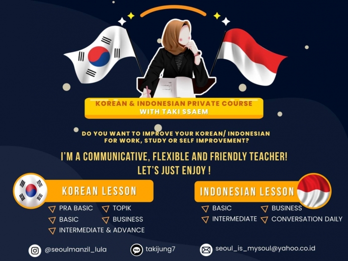 인도네시아 자카르타에 거주하시는 인니어/한국어 과외를 원하시는 분을 찾고 있습니다. 또한 한국인 직원을 보유하고 있는 회사에서 인도네시아어 수업을 할 수 있는 강자 자리 및 그룹 과외 강사를 구하고 있습니다. 현재는 코로나로 인해 원격수업만 가능합니다. 추후 상황에따라 대면 수업을 진행할 예정입니다. 저는 한국어를 전공한 졸업자이며 자세한 경력은 아래와 같습니다. 경력: (2010년 ~ 현재) *한국 문화원 인도네시아어 강사 *한국인 대상 개인/그룹 과외 진행 - 50명 이상 *인도네시아인 대상 한국어 개인 과외 진행 - 90명 *인도네시아 주재 한국 업체 직원 강사 - 7회 진행 (수업당 7명이상 동시 진행) *11년 이상 한국어/인니어 과외를 진행해온 경험이 있으며 주재원 및 가족분들의 개인/그룹 레슨을 진행한 경험이 많습니다. 거주지 *꼬따 브카시 폰독그데 거주중 (동쪽 자카르타 지역) *이름: Taki (타키) / 여 *국적: 인도네시아 1. 레슨 시간 및 가격 *주 2회 / 회당 60분 수업 (원하시는 경우 조절 가능) *가격은 인원/장소/시간등에 따라 약간 차이가 있으니 연락 부탁드립니다. *지불방법: 선금 지불 대상: * 회사내 한국인 직원을 대상으로한 인도네시아어 수업 / 현지인을 위한 한국어 수업 * 개인 레슨 및 2인 이상의 그룹 과외를 희망하시는 분 * 인도네시아어 초급 - 중급 수준의 ; 비즈니스 수업을 받고 싶어 하시는 한국분들 * 한국어 초급 - 중급 - 한국어 능력 시험 수업을 받고 싶어 하시는 인도네시아분들 수업방법 * 주로 마이크로소프트 365 팀즈를 사용합니다. 문제 생기거나 안될 경우에는 구글 미팅도 사용합니다. 교재는 메일이나 카톡으로 PDF 및 사진을 보내드리겠습니다. *기본교재는 제가 준비하며 필요한 수준을 말씀해주시면 됩니다. *수업은 한국어 및 인니어로 설명 진행 *인도네시아 직원을 위한 한국어 수업 교재도 보유 중이며 단체 수업도 가능합니다. *가격의 경우 연락을 주시면 기간과 업무에 따라 답변을 드리겠습니다. 이메일 연락처 : seoul_is_mysoul@yahoo.co.id 보내주실 때 전화번호도 같이 주시면 바로 SMS 또는 답장 드리도록 하겠습니다. (인도웹 쪽지나 여기 comment 보다는 자주 들어오지 못하니 꼭 메일로 보내주시길 바랍니다.) 항상 행복한 인도네시아 생활 되시고 감사드립니다. *많은 분들이 번역 문의를 주시는데 죄송하지만 번역 업무는 정중히 사양합니다. 감사합니다. |