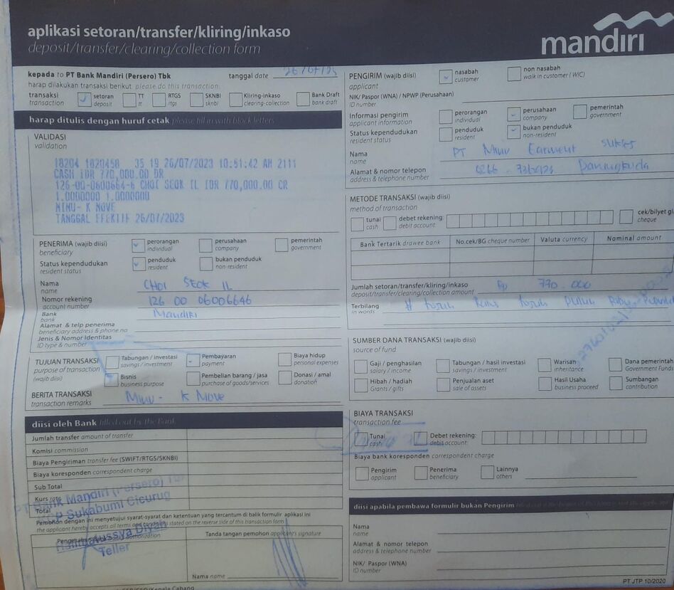 입금일, 입금 은행(BCA, Mandiri, 농협, 국민 중 하나), 금액