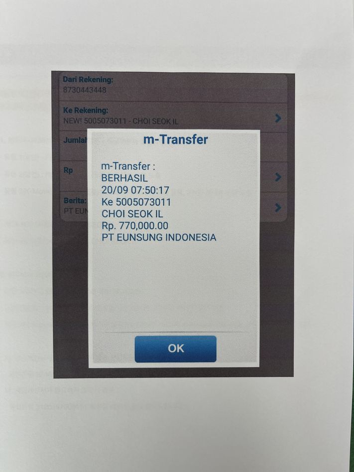 입금일, 입금 은행(BCA, Mandiri, 농협, 국민 중 하나), 금액