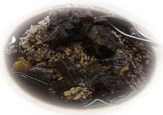 한글 뜻: 향신료와 kelauk(검정색의 kepayang 나무 열매)을 고기와 함께 넣어 요리한 국물 있는 음식. (영 : (Java) k.o. beef stew made with keluak.)