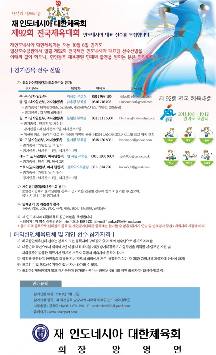 하기와 같이 "제 92회 전국체육대회" 인도네시아 대표 선수를 모집하오니