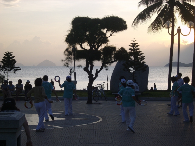 베트남 나짱의 새벽동이 트는 해변에서 단체 운동하는 베트남사람들