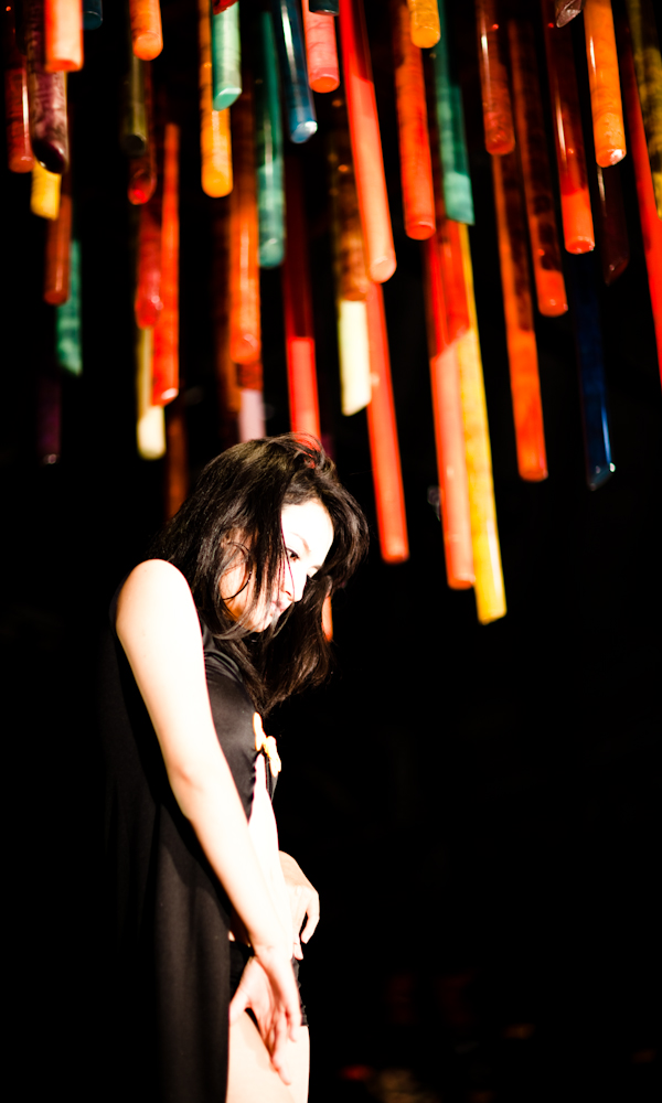 어두운 배경 과 검정색 모델의상..그리고 천장의 오색 장식..