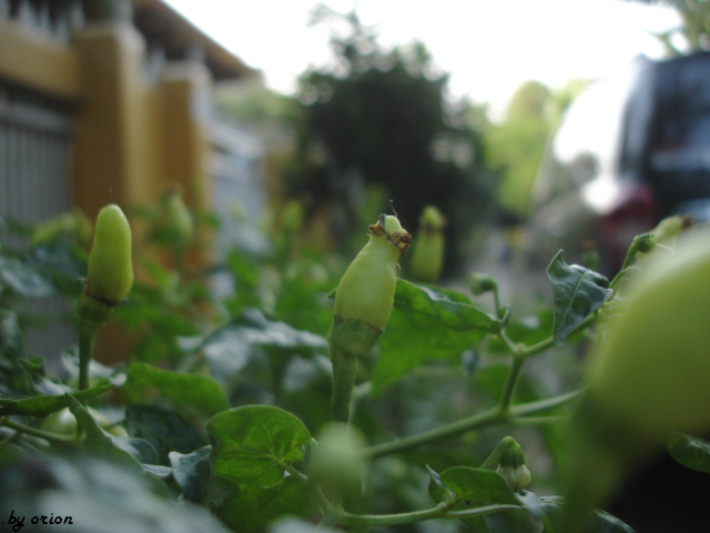 이웃집 울타리에 하늘을 향해 맺혀진 고추를 보며