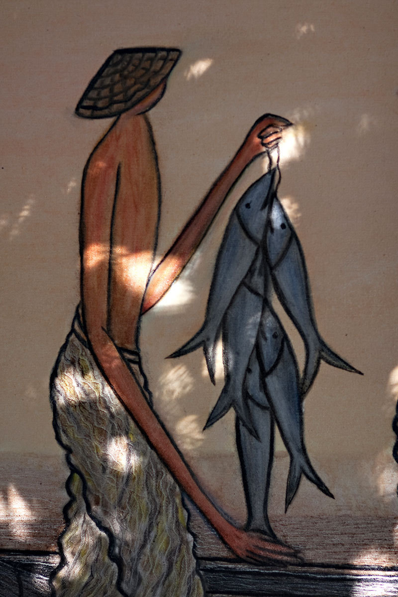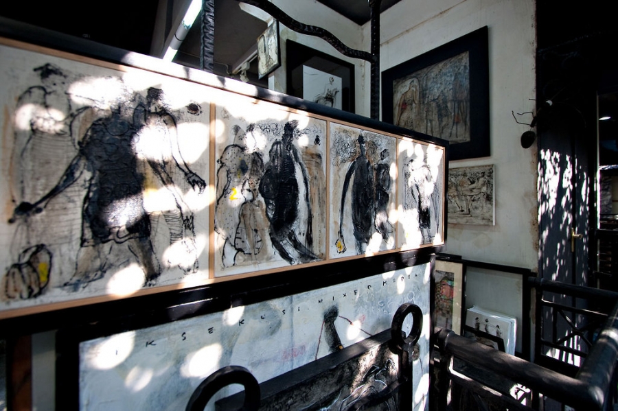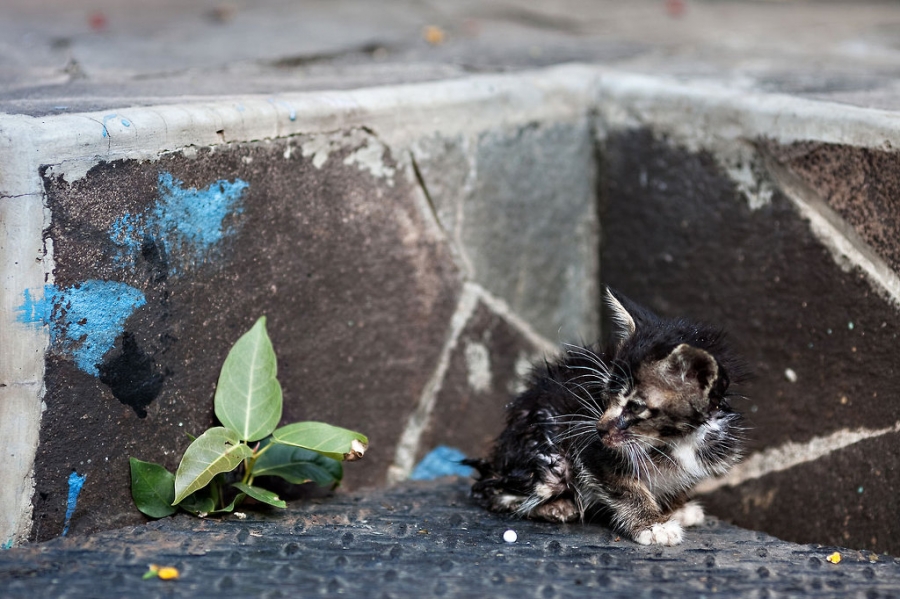물에 젖은 불쌍한 고양이(아마도 주인 없는 버려진 고양이 같은데)가 자신과 비슷한 처지에서 자라고 있는(열악한 환경) 식물을 보고 있는 모습이 인상적이네요. 파란색 페인트 자국이 더 운치를 더하네요.