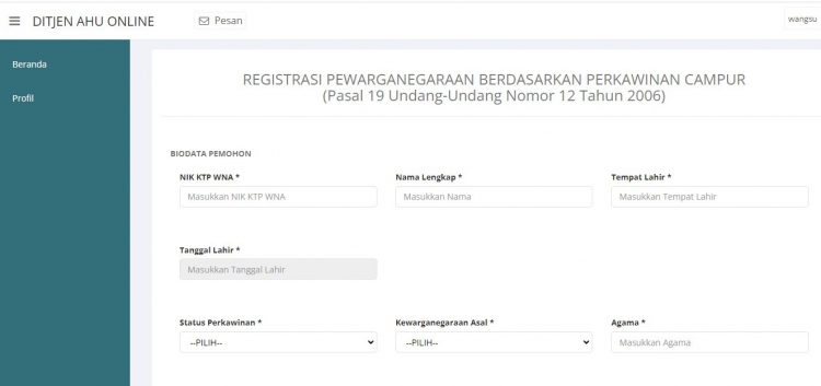 법무인권부장관 규정에서 신청자는 인도네시아 시민인 여성 또는 남성과 합법적으로 결혼한 외국 시민인 남성 또는 여성을 의미합니다. 신청자는 공식 시민권 페이지 pewarganegaraan.ahu.go.id를 방문하여 장관에게 전자적으로 제출된 신청서를 통해 인도네시아 시민이라는 진술서를 제출함으로써 인도네시아 공화국 시민권을 취득할 수 있습니다 . 이 페이지에 필요하고 업로드해야 하는 필수 문서는 다음과 같습니다.