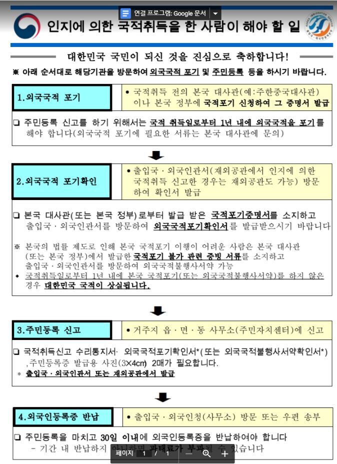 현재 인도네시아 거주중이고 첨부 드리는 파일과 같이 한국 출입국관리 사무소에서 안내받았습니다. 한국 국적 취득을 위해 우선 인도네시아 국적 포기를 진행해야 하는 상황입니다.