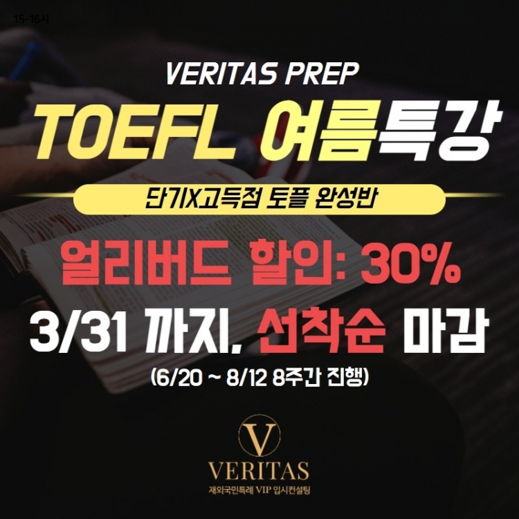 베리타스 컨설팅 TOEFL 여름 특강 개설 안내(얼리버드 할인 30% 진행 중(~3/31, 선착순 마감))