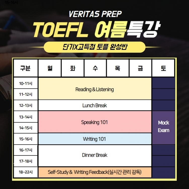 오늘은 저희 베리타스 컨설팅에서 6월 20일 월요일부터 개강 예정이며, 약 8주 간 진행되는 토플 여름 특강에 대해 소개하고자 합니다.