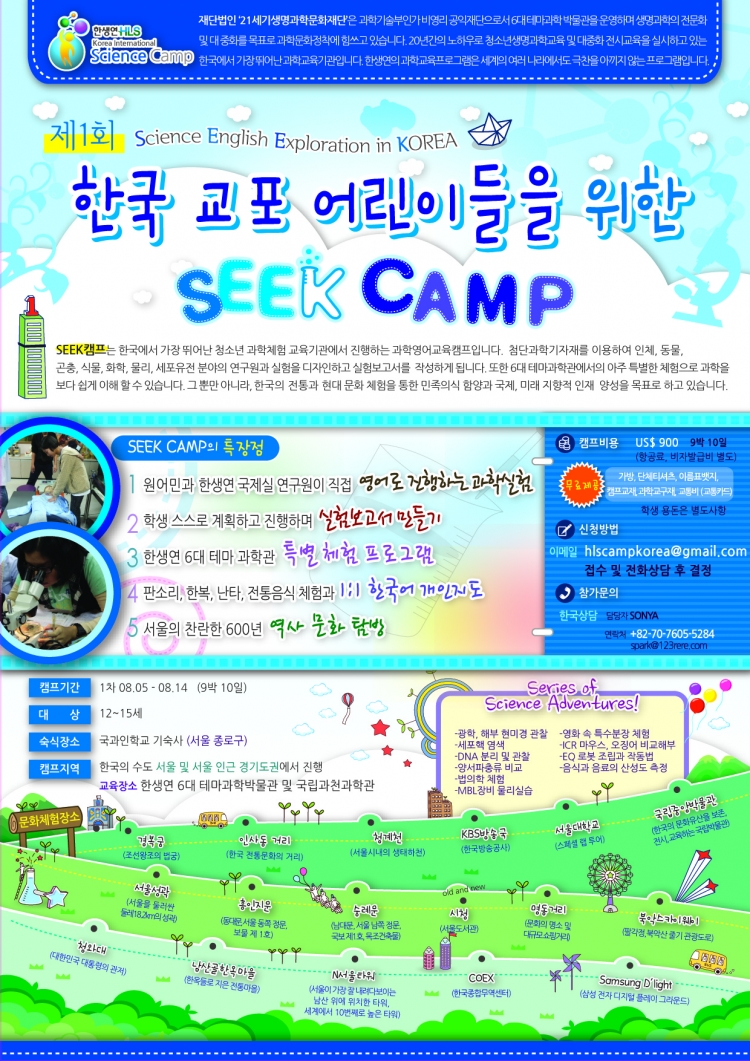 지난 3년간 23회에 걸쳐 태국, 일본, 중국 학생들이 SEEK CAMP를 통해 많은 과학적 지식을 쌓고 문화 체험을 하였습니다. 이번에는 해외에서 학교를 다니는, 1.5세와 2세학생들을 위한 캠프를 준비하였습니다. 서울 도심 종로구 명륜동 소재 편안하고 안전한 기숙사에서 영양을 고려한 식단으로 생활합니다. 첨부된 파일과 홈페이지를 통해서 한국생명과학연구소에 대한 더 많은 정보를 얻으실 수 있습니다. 올 여름방학을 서울에서 특별하게 보내고 싶은 인도네시아학교 학생들의 많은 관심 부탁드립니다.