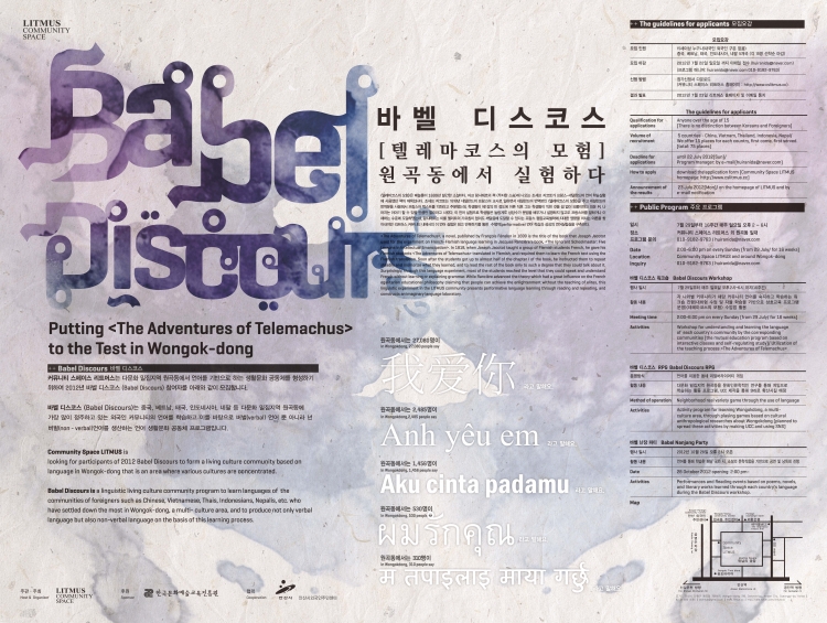 Community Space LITMUS is looking for participants of 2012 Babel Discours to form a living culture community based on language in Wongok-dong that is an area where various cultures are concentrated.