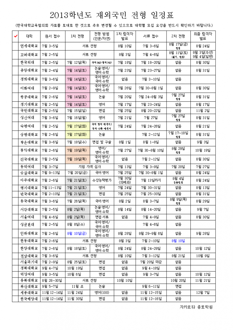 2013학년도 재외국민 특별전형 주요대학 일정 및 관련 자료 안내