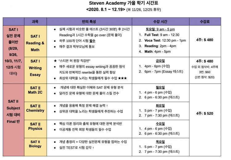 Steven Academy 가을 학기 시간표 <2020. 8…
