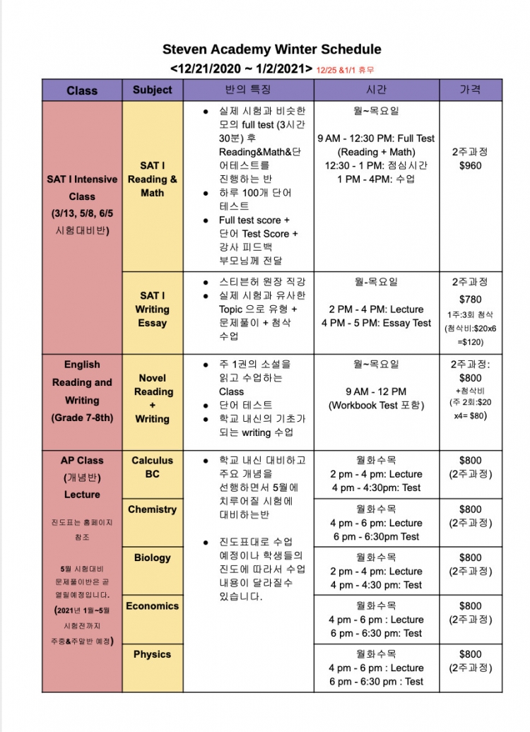 2020년 겨울 시간표 입니다. (21년 3,5,6월 SAT시험…