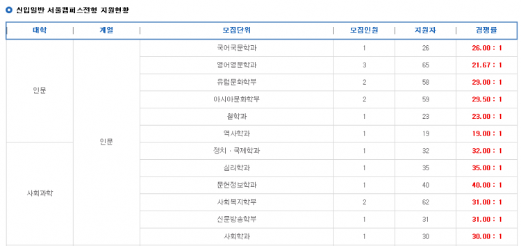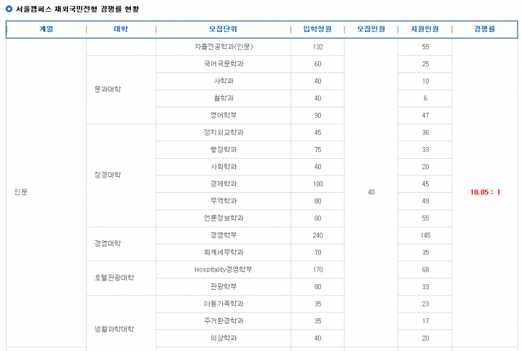 경희대학처럼 계열별 선발을 하는 대학에서는 해당 학과에 몇 명이 지원했느냐 하는 것은 중요하지 않습니다. 인문계의 경우 총지원자는 722명이고 선발 인원은 40명이므로 3배수 선발을 한다고 할 때 필기시험에서 120등 안에 들어야 1차 합격이 되는 것입니다. 즉 상위권 학생들이 주로 지원하는 몇몇 인기 학과에서 집중적으로 합격자가 나올 수밖에 없는 구조입니다. 따라서 성적 때문에 학과를 낮추어 지원하는 것이 거의 의미가 없게 되는 것입니다.