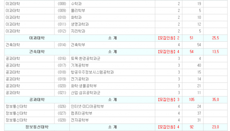 건국대처럼 학부별로 선발하는 경우에는 해당 학부의 경쟁률만 보면 되겠지요. 건축대학의 선발 인원이 4명이고 총 지원자가 54명이므로 만일 5배수 선발을 한다고 하면 20등 안에 들면 1차에서 합격을 하는 셈입니다. 그러나 동일한 이과대학 내에서는 수학과냐 물리학과냐는 중요한 것이 아니고 이과대학 내에서 몇 등을 하느냐가 당락을 결정합니다.