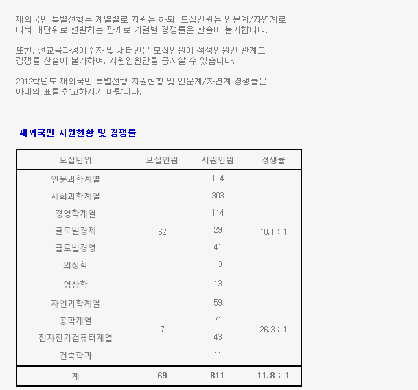 2012학년도 재외국민 지원 현황에 대한 성균관대학의 공지