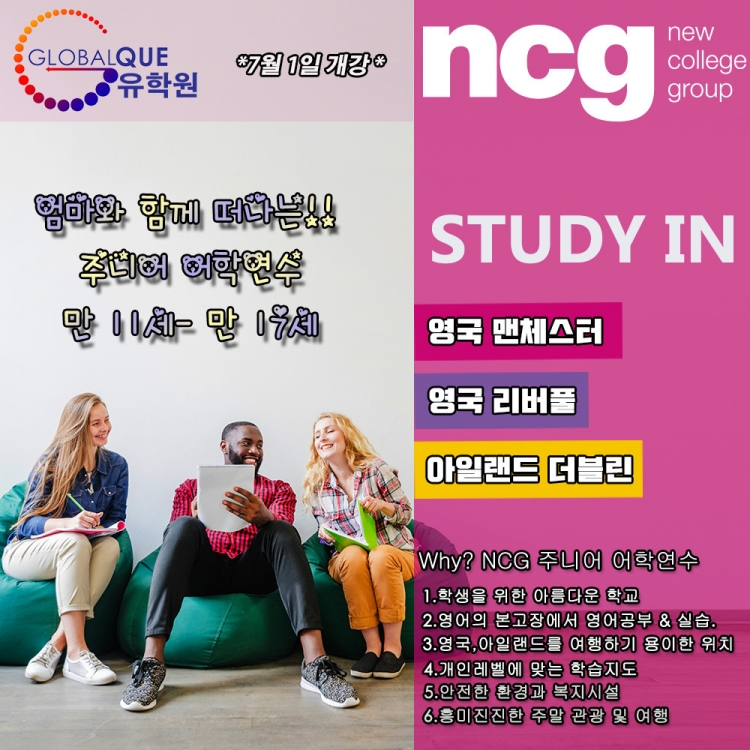 NCG(New College Group) 어학원은 영국 맨체스터 본점, 리버풀, 아일랜드 수도 더블린에 위치한 어학원으로서 일반 영어 수업, IELTS 준비, 비지니스, 법률, 군대, 미디어, 마켓팅 등 기초영어 클래스부터 전문분야 영어클래스까지 다양한 커리큘럼을 운영하고 있습니다. NCG는 여타 대형어학원 보다 큰 규모는 아니지만 학생 개개인에게 좀 더 집중하고 케어한다는 운영철학을 가지고 있습니다. NCG어학원은 방과후 보충수업과 1:1 수업이 준비되어 있어 수업에 대한 질문이 있다면 그날그날 복습할 수 있는 분위기를 조성하고 있습니다.
