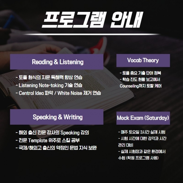 저희 베리타스 토플 프로그램은 토플의 가장 기본이 되는 Reading& Listening, Speaking& Writing 그리고 Vocab Theory를 제외하고도