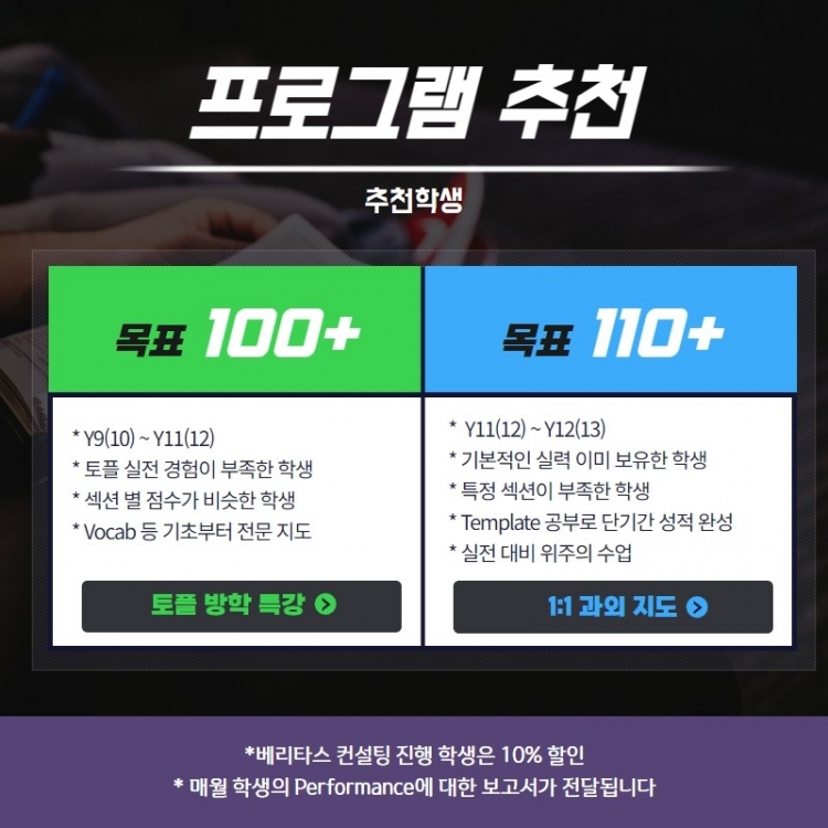저희 베리타스 컨설팅에서 진행하는 토플 프로그램은 105점 이상을 목표로 하는 학생들을 대상으로 하는 정규반과 115점 이상을 목표로 하는 1:1 과외 수업으로 나뉘는데요.