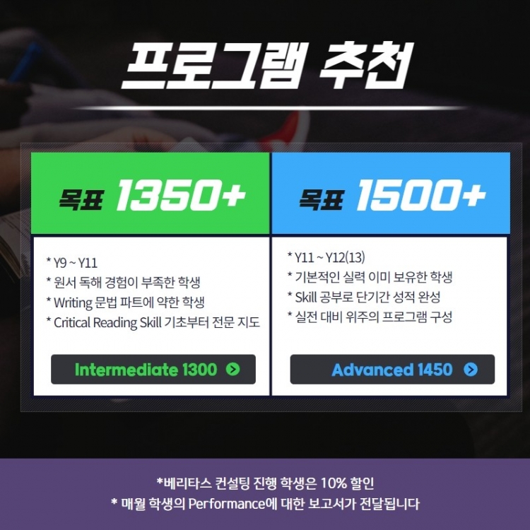 저희 베리타스 컨설팅에서 진행하는 SAT 프로그램은 원하시는 기간 (Ex. 7월 둘째주 ~ 8월 첫째주까지)을 골라 자유롭게 수강하실 수 있습니다.