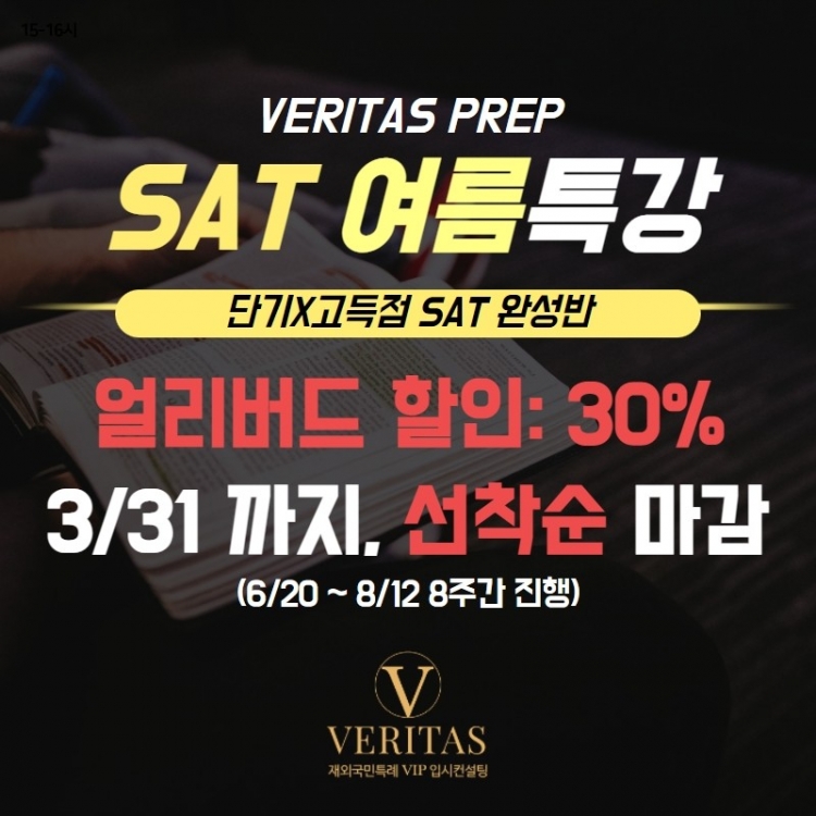 베리타스 컨설팅 SAT 여름 특강 개설 안내(얼리버드 할인 30% 진행 중(~3/31, 선착순 마감))