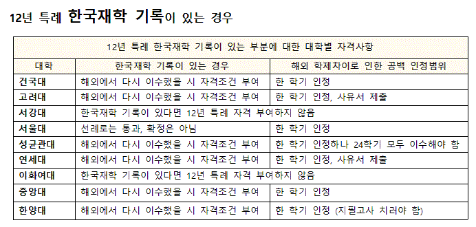 건국대와 고려대, 성균관대, 중앙대는 한국재학 기록이 1년(2개 학기)를 넘지 않은 학생 중 해외에서 해당 학년을 다시 이수했을 경우 12년특례 자격조건을 부여하고 있다. 그러나 △한국 재학 기간이 초·중등 과정이어야만 하며 △1학년 1학기는 반드시 해외에서 입학해야 한다는 전제조건이 붙는다.