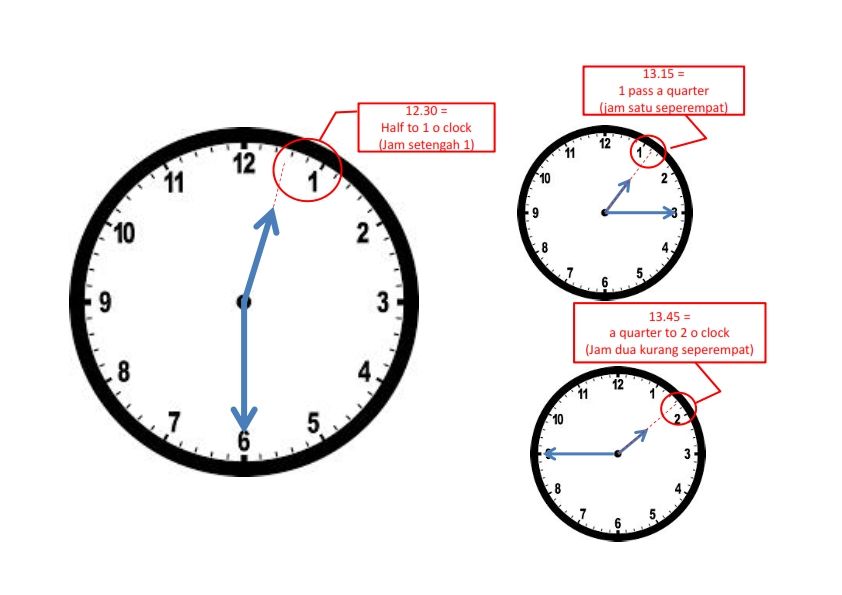 12.30 = jam dua belas lewat tiga puluh = jam setengah satu (시계바늘은 '12자'와 '1자' 중간에 있어서 setengah 1는 'setengah jam lagi menuju jam 1'의 뜻임)